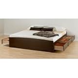 Our King Platform Storage Beds combine extra large drawers for plenty of storage space with a slat support system that requires only a mattress. Wood slats are positioned lengthwise to distribute body weight evenly, minimize the amount of motion transfer and take the place of a box-spring. Metal braces under the slats provide additional stability. Underneath are 6 large storage drawers (20” depth) that run on smooth running metal drawer glides. Drawers open easily with finger pulls located at the bottom of drawer fronts and knobs have been eliminated to prevent bedclothes from catching. They are large enough to hold anything you need to store: linens, blankets, clothes, socks and even shoes are just a few ideas. Coordinate with other Prepac espresso furniture from our Manhattan or Regency collections. Overall bed height is 21” if used with an 8” thick mattress. Available in two attractive finishes: Black and Espresso overlay laminates. This product is made from composite woods with plywood slats. It ships flat-packed (in three cartons) and self-assembly is required. Detailed and easy-to-follow instructions are included. Read more