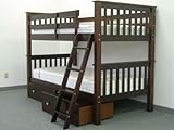 FREE SHIPPING Solid Wood Cappuccino Finish Mission Style Twin over Twin Brazilian Pine Bunk Beds with 2 Drawers or can be split to 2 Twin Beds. Can be separated in to matching twin beds. This bunk bed model has been tested by an independent laboratory and is in compliance with the ASTM F-1427 standard consumer safety specification for bunk beds and the government code of federal regulations 1213 and 1513. Finish is child-safe and lead free. All wood is fully sanded and protected with a clean smooth coating to prevent cracks and splinters. Solid Brazilian Pine - no particle board. Ladder rungs are flat (not vertical) for added comfort for your child's feet and can be either attached permanently with screws or hooked on and off. Set includes (4) Side Rails (2) Head Boards (2) Foot Boards (1) Ladder (26) Wood Slats and Guard Rails on both sides for the top twin bunk + 2 Under Bed Drawers. Total bunk bed external dimensions are approx 62 inches high x 82 inches long x 42 inches deep. Bottom bunk is approx 11 inches off the floor - space between bottom bunk slats and top bunk slats (excluding the mattress) is approx 30 inches. Each Drawers external dimensions are approx 11 inches high x 37 1/2 inches long x 23 1/2 inches deep - Internal dimensions are approx 8 inches high x 34 1/2 inches long x 22 inches deep. No need for a bunkie board or a bunkie mattress as our bunk beds only require standard twin size (39 inches x 74 inches) mattresses. Hardware and instructions included - some assembly required. Sale is for bunk beds only - excludes mattress, pillows and bed coverings Read more